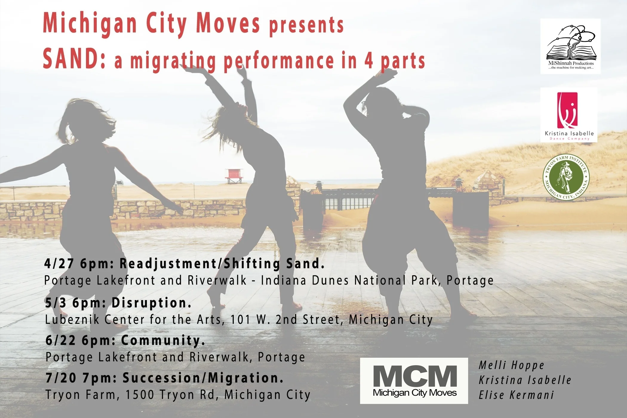 Sand: A Migrating Performance in Four Parts is made possible through partnerships with Save the Dunes, MiShinnah Productions, Kristina Isabelle Dance Company, the Indiana Dunes National Park and the Tryon Farm Institute.